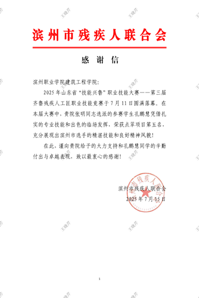 2025 年山东省“技能兴鲁”职业技能大赛--第三届齐鲁残疾人工匠职业技能竞赛于7月 9 日至11日在鲁中高级技工学校成功举办。赛后,滨州市残疾人联合会向我校304永利集团发来感谢信,对学院给予竞赛的大力支持以及参赛学生的出色表现表示衷心感谢。此次大赛由省残联、省总工会共同主办,吸引了来自全省16市及山东特殊教育职业学院的17支代表队、220余名优秀残疾人选手同台竞技。大赛设置了信息通信及新一代信息技术类、美术专业类、手工业类等五大类9个竞赛项目。...