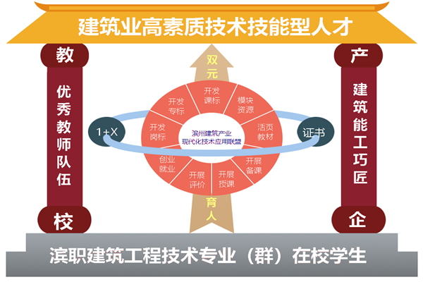 与中建八局第四建设有限公司、合肥工业大学联合牵头组建全国智能建造与城市更新产教融合共同体;与山东滨州城建集团有限公司、广联达科技股份有限公司、山东天齐置业集团股份有限公司等11家优质企业深度合作,其中,与山东滨州城建集团有限公司共同申报山东省职业教育技能大师工作室,与山东百库教育科技有限公司进行在线开放课程开发,与广州中望龙腾软件股份有限公司校企共建国产工业软件现代产业学院。