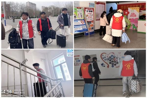 志愿护航,传递校园“暖心温度”。返校期间,学院组织志愿者分驻南大门、男女生公寓等重点区域,开展行李搬运与引导服务。志愿者们身着统一服装,主动接过沉甸甸的行李箱,用脚步丈量校园,用行动传递温情,让返校学子第一时间感受到“家”的归属感,生动展现了建工学子“奉献、友爱、互助、进步”的青春风采。